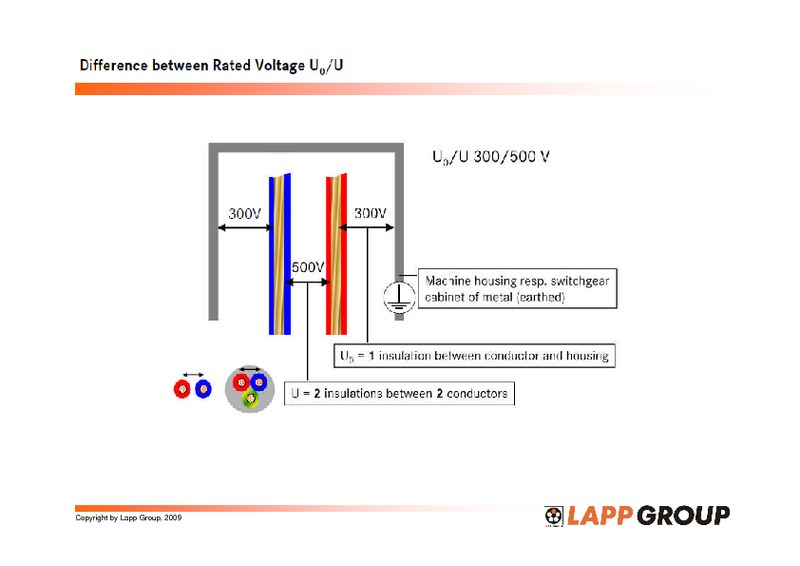 U vērtība ir augstāka par U0 vērtību, jo starp diviem elektrībai pieslēgtiem daudzdzīslu kabeļa vara vadiem vai divām atsevišķām sadales skapja dzīslām vienmēr atrodas divas izolācijas kārtas, kas kalpo elektriskajai separācijai.